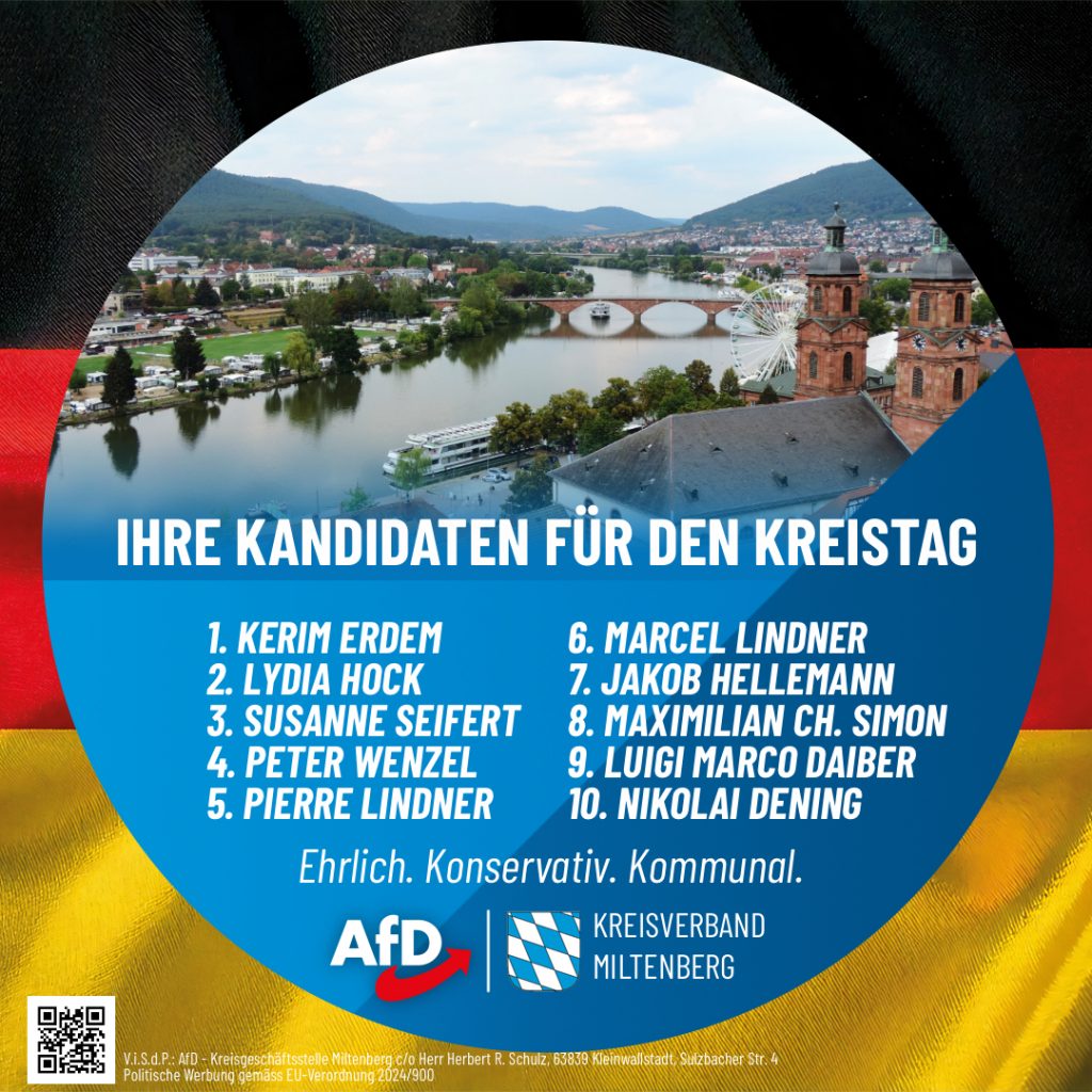 AfD-Kreistagswahlprogramm erarbeitet und den ehemaligen CSU-Kreisrat und früheren Erlenbacher Stadtrat Dr. Christian Steidl zum AfD-Landratskandidaten nominiert. Die Alternative für Deutschland (AfD) will Wohlstand und Arbeitsplätze durch bezahlbare und verlässliche Energieversorgung sichern, statt Spessart und Odenwald mit Windkraftanlagen zu überbauen, die den Strompreis weiter in die Höhe treiben würden. Die AfD setzt auf Aufklärung über mögliche Impfschäden sowie auf echte Bildung, statt auf Impfkampagnen und Klimaangst.