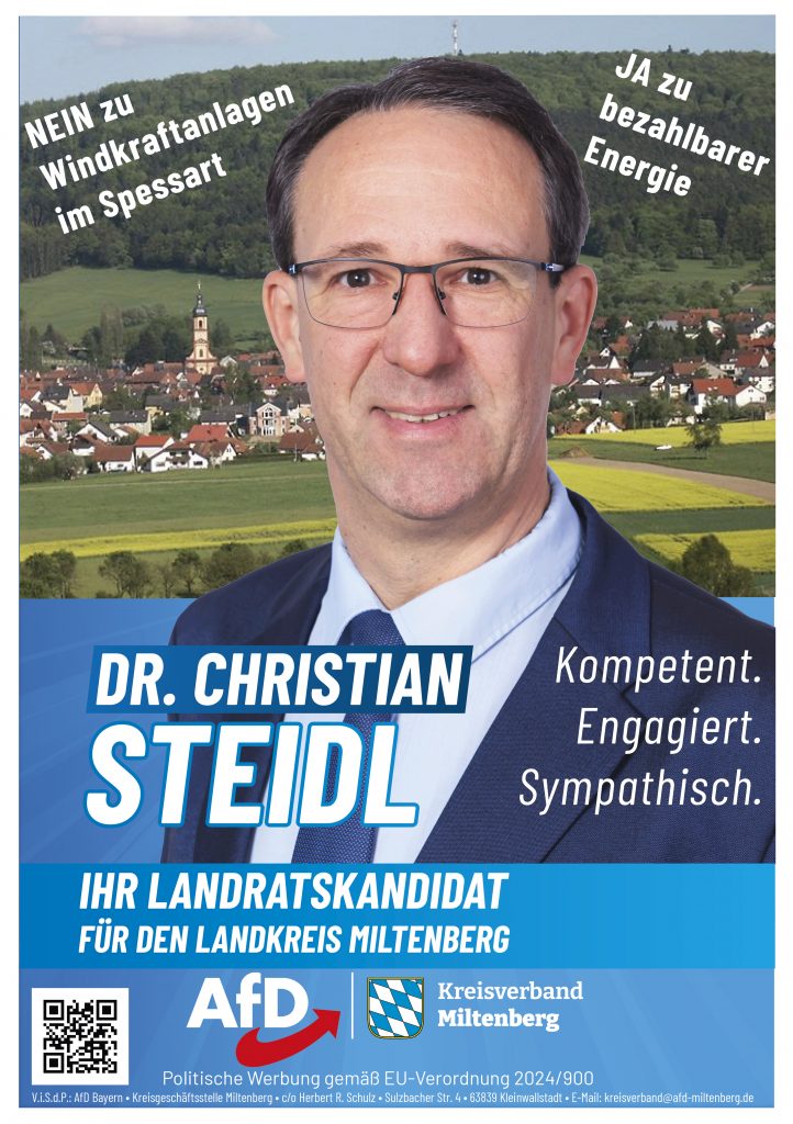 „Wir freuen uns, mit Dr. Christian Steidl einen erfahrenen Kommunalpolitiker als Landratskandidaten gewonnen zu haben, der bereits auf 15 Jahre Tätigkeit als Stadtrat und 9 Jahre als Kreisrat in unserem Landkreis Miltenberg zurückblicken kann“, betont der AfD-Kreisvorsitzende Herbert R. Schulz, der Dr. Steidl noch aus der gemeinsamen Zeit in der CSU kennt. Der AfD-Pressesprecher Kerim Erdem hebt die Fachkompetenz des Diplom-Chemikers Dr. Steidl in Klima- und Impffragen hervor. „Er hat als Redner bei Kundgebungen während der Corona-Zeit und als Referent bei unseren Stammtischen gezeigt, dass er den Menschen vermitteln kann, warum Deutschland auf vielen Ebenen einen Politikwechsel braucht.“